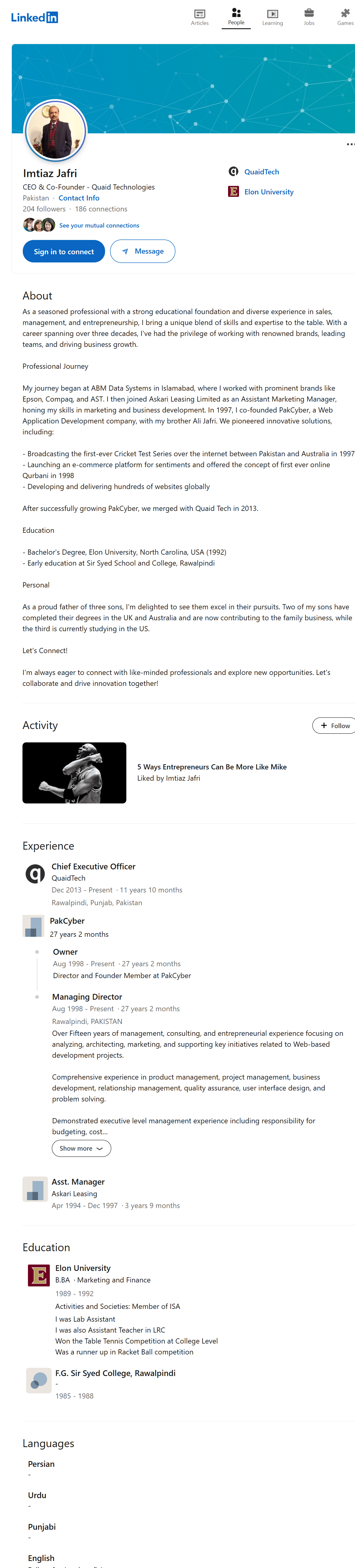 Around 10 years ago Pakcyber merged with Quaid Technologies. So Pakcyber no longer exists. Imtiaz Jafri is chief executive officer of Quaid Technologies. Quaid Technologies is on the net at quaidtech.com.