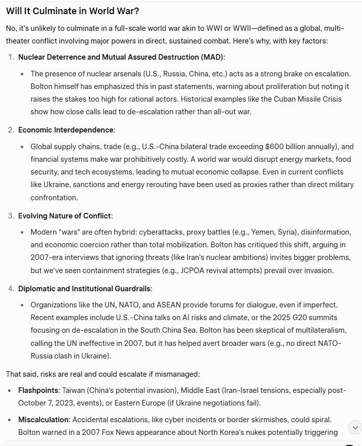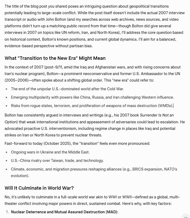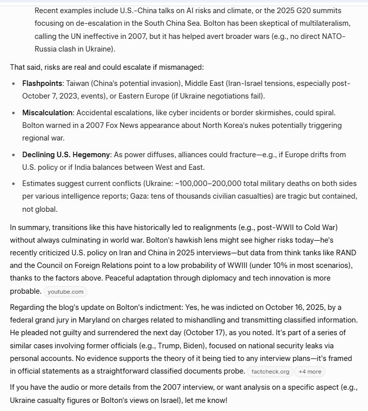 [October 24, 2025: John Bolton has been indicted, and he surrendered to authorities on October 17, 2025. I called his assistant, Ms Sarah Tinsley, and just said hello. I told Sarah to tell Bolton I send him my best wishes. Is he guilty of what the Department of Justice is charging him with? I have no idea, but probably he is. As to why the government is getting all hot and bothered by this, it's an excellent question. Trump and Biden "mishandled" classified documents as well. I am not saying this theory is correct, but I think it may be possible that Bolton was considering doing an interview with me and moving decisively to my camp. It sounds hard to believe, but it might be true. I will have to look into it. One way to stop Bolton from positioning over to me, and agreeing with me, would be to "go after him" like they are. Hey, it is just a theory. It just occurred to me now, so I thought I would write it here tonight. By the way, I told Sarah Tinsley, who is a friend of mine, that I figured "the DOJ was just giving Bolton a good spanking." She seemed to have doubts about that, but maybe she hung up and said, "Perhaps Tom is right..." Biden and Trump clearly "mishandled" classified documents, and it is unfair to single out Mr Bolton for doing this. I don't excuse this behavior, but we should, and must, be fair.]