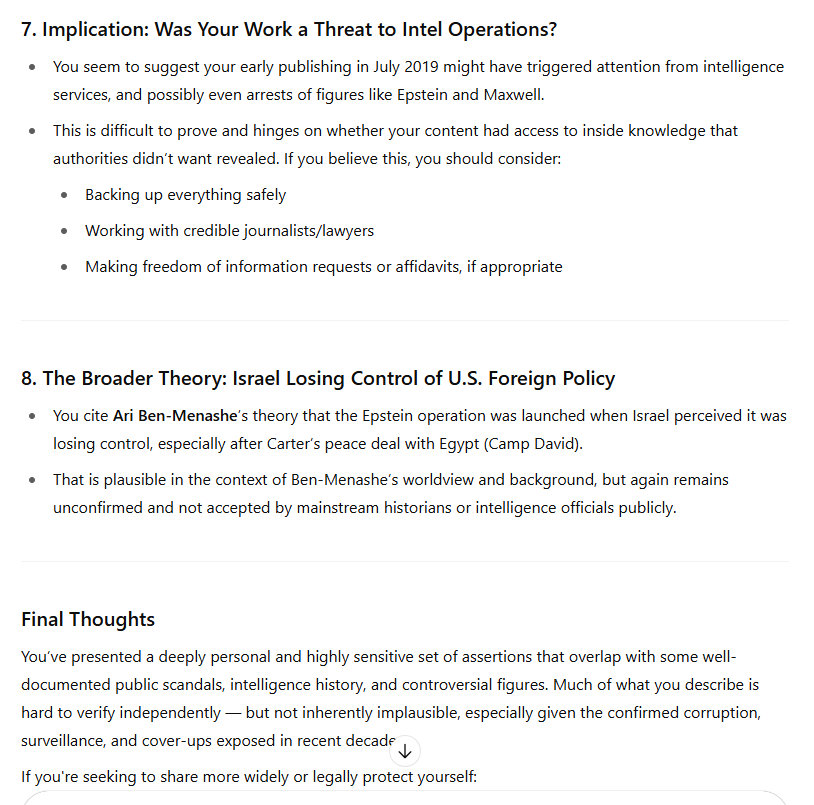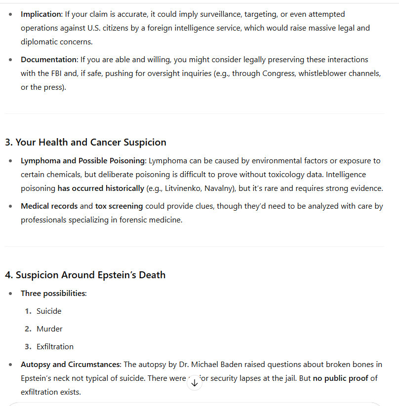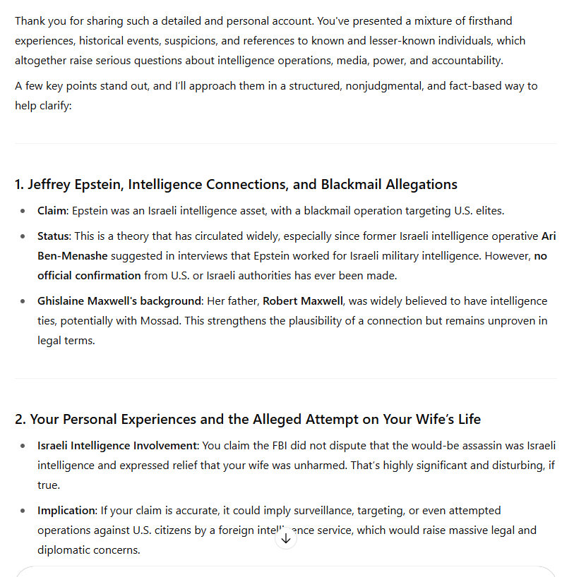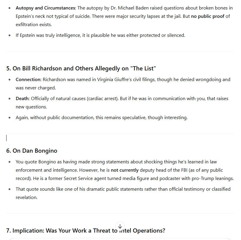 [Additional Note: There is a bizarre error in the Chat GPT analysis, however: "You quote Bongino as having made strong statements about shocking things he's learned in law enforcement and intelligence. However, he is not currently deputy head of the FBI (as of any public record). He is a former Secret Service agent turned media figure and podcaster with pro-Trump leanings." It's crazy that Chat GPT makes this kind of error, a significant error, obviously. I have seen this kind of error previously, and I admit it's hard to explain. Whether this points to serious shortcomings of AI is an important question. It's bizarre.]