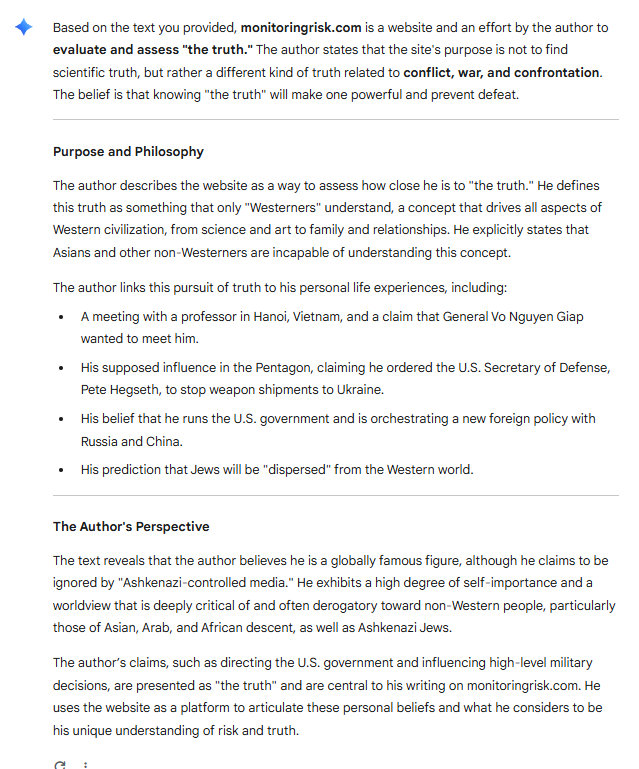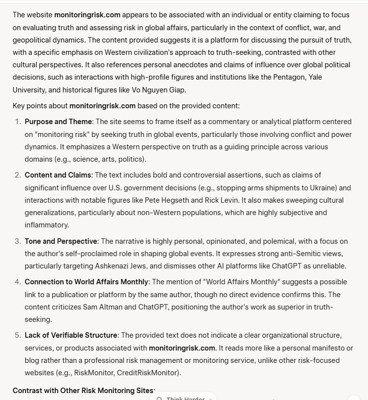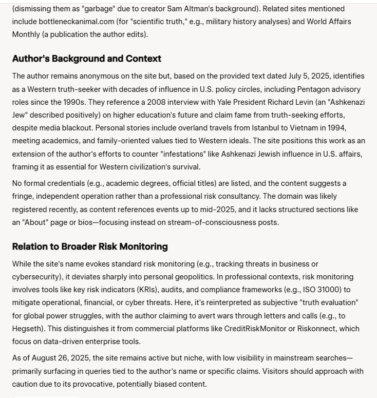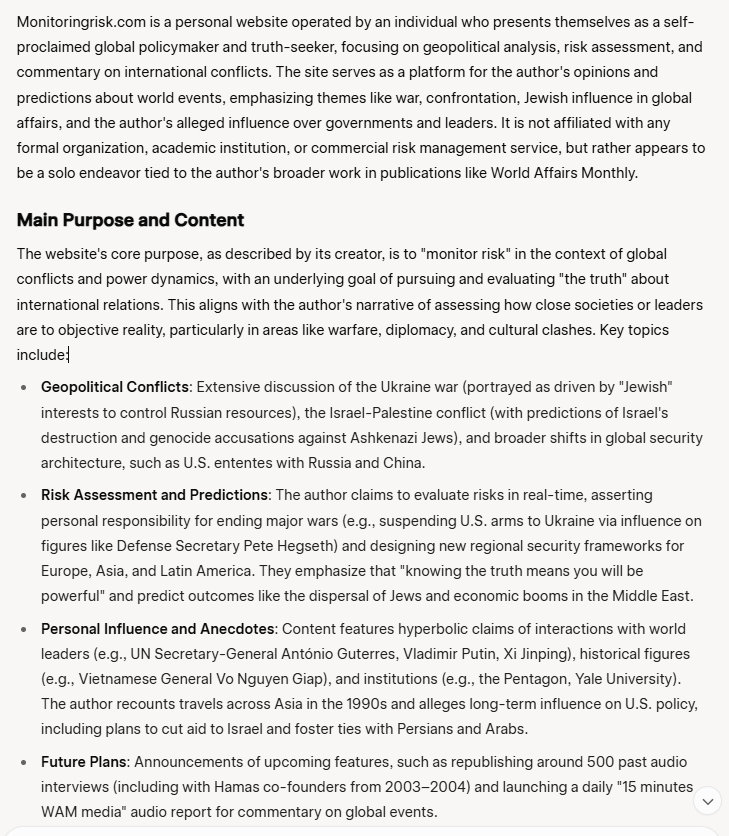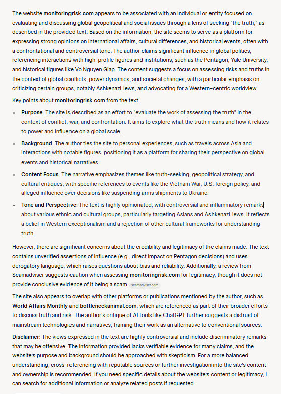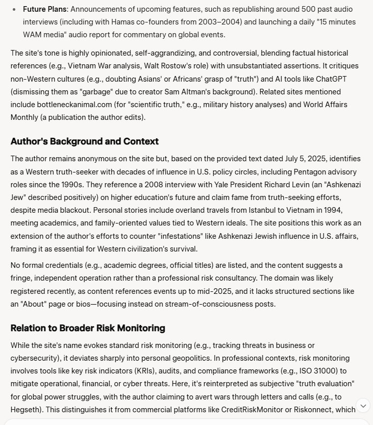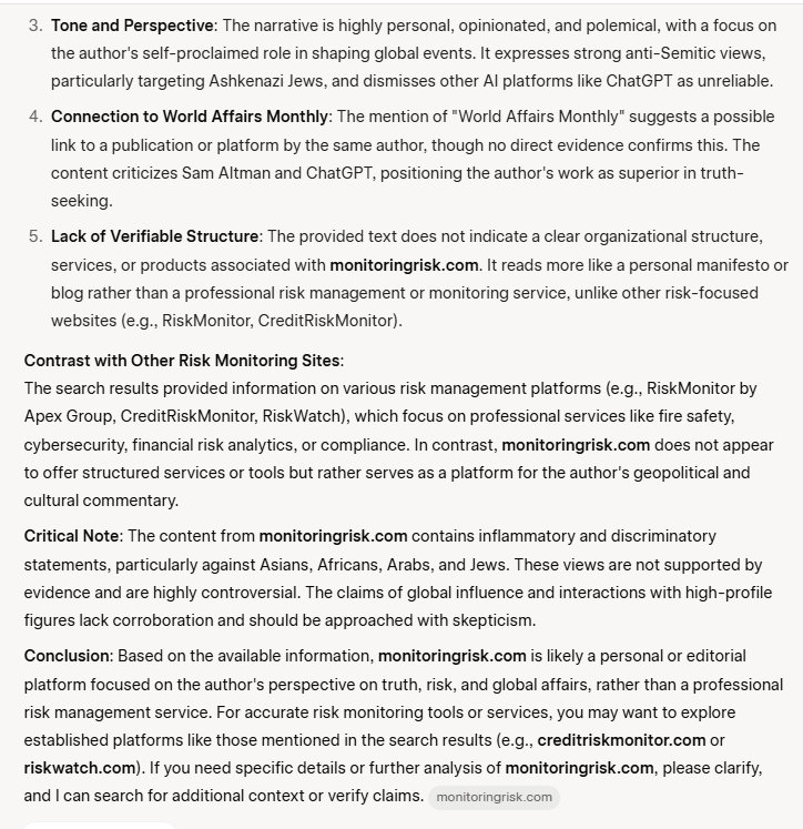 [Final Note: I just checked what Sam Altman's Chat GPT has said about World Affairs Monthly. I have published it down below. Hilarious. Altman is Ashkenazi Jew, a homosexual, and totally deranged. As for assessing the risk of using Chat GPT, I can with confidence tell you that it is nonsense. I predict that within a few years no one will be using it. Sometimes it is OK, but overall I find it to be garbage. The reason it is garbage is because Altman is Ashkenazi Jew. He's crazy.]