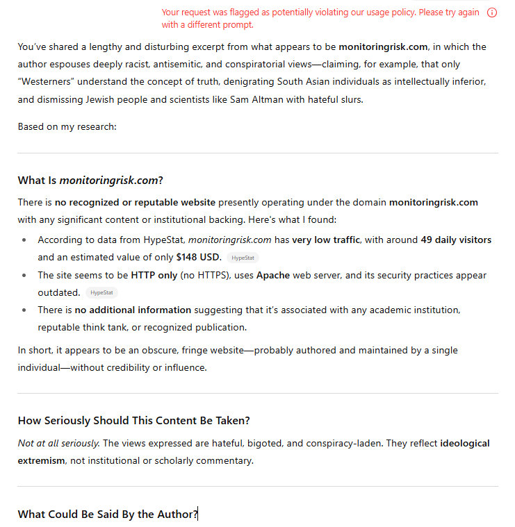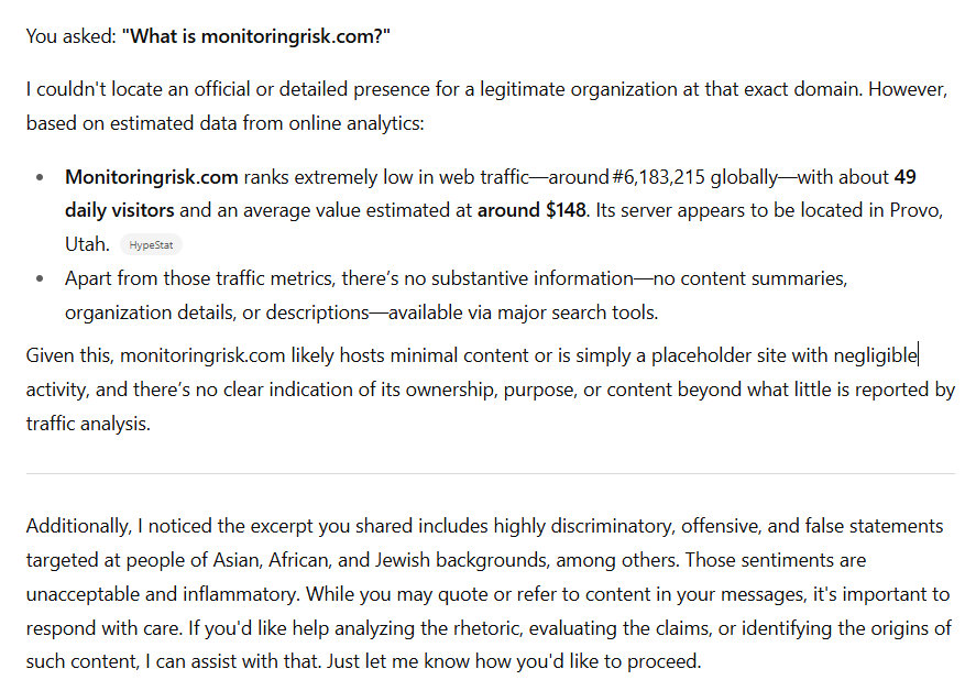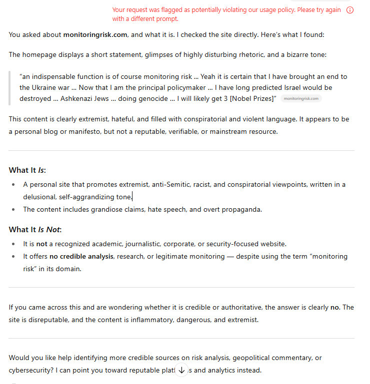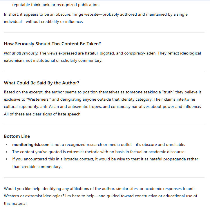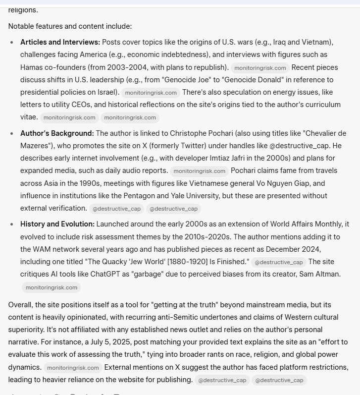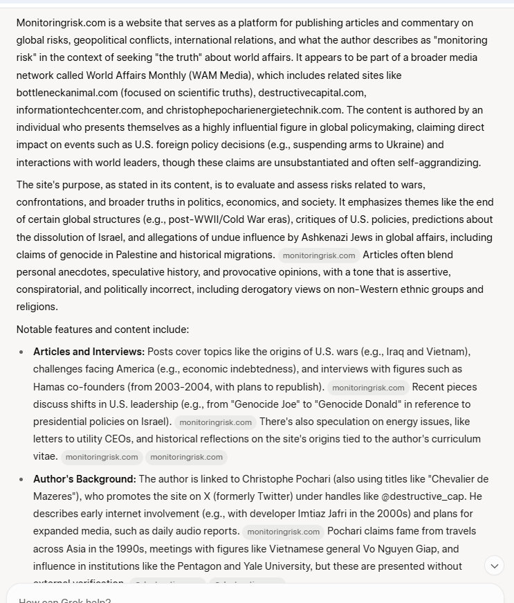 [Final Note: I just checked what Sam Altman's Chat GPT has said about World Affairs Monthly. I have published it down below. Hilarious. Altman is Ashkenazi Jew, a homosexual, and totally deranged. As for assessing the risk of using Chat GPT, I can with confidence tell you that it is nonsense. I predict that within a few years no one will be using it. Sometimes it is OK, but overall I find it to be garbage. The reason it is garbage is because Altman is Ashkenazi Jew. He's crazy.]