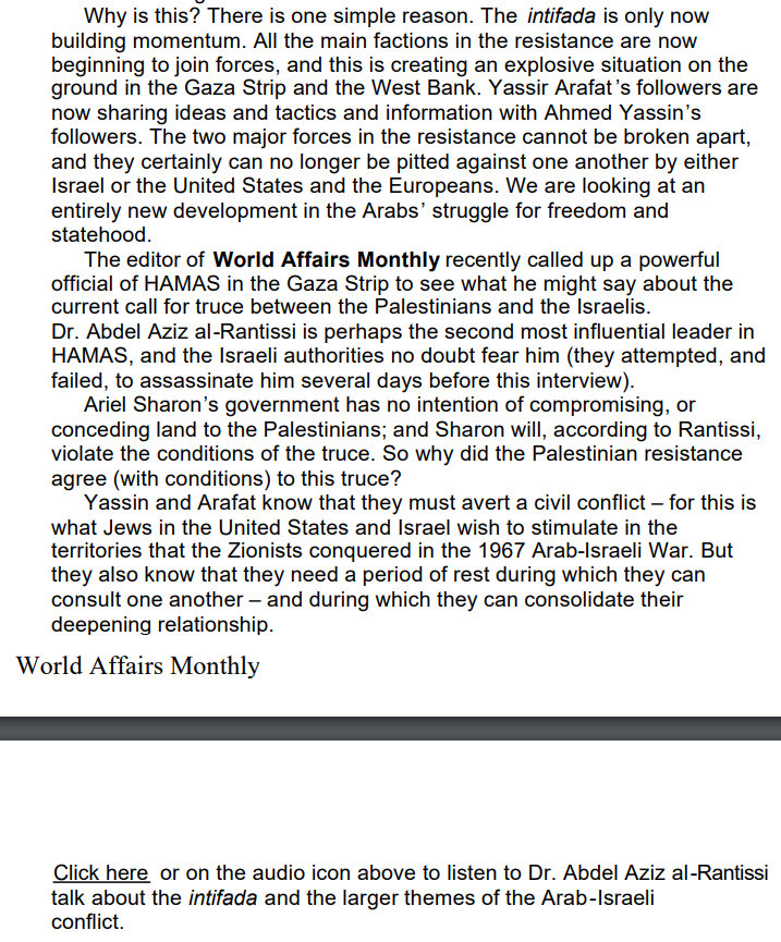 So we did reschedule and this new date was the interview I am writing about today. So the Jews in Israel attempted to kill Rantisi because I was talking to him. The New York Times or The Economist or CNN or whatever would of course not mention this was happening – because of me. These are not news businesses, they are Jewish-controlled propaganda businesses. Lies and garbage. Hard to believe anyone actually takes them seriously.