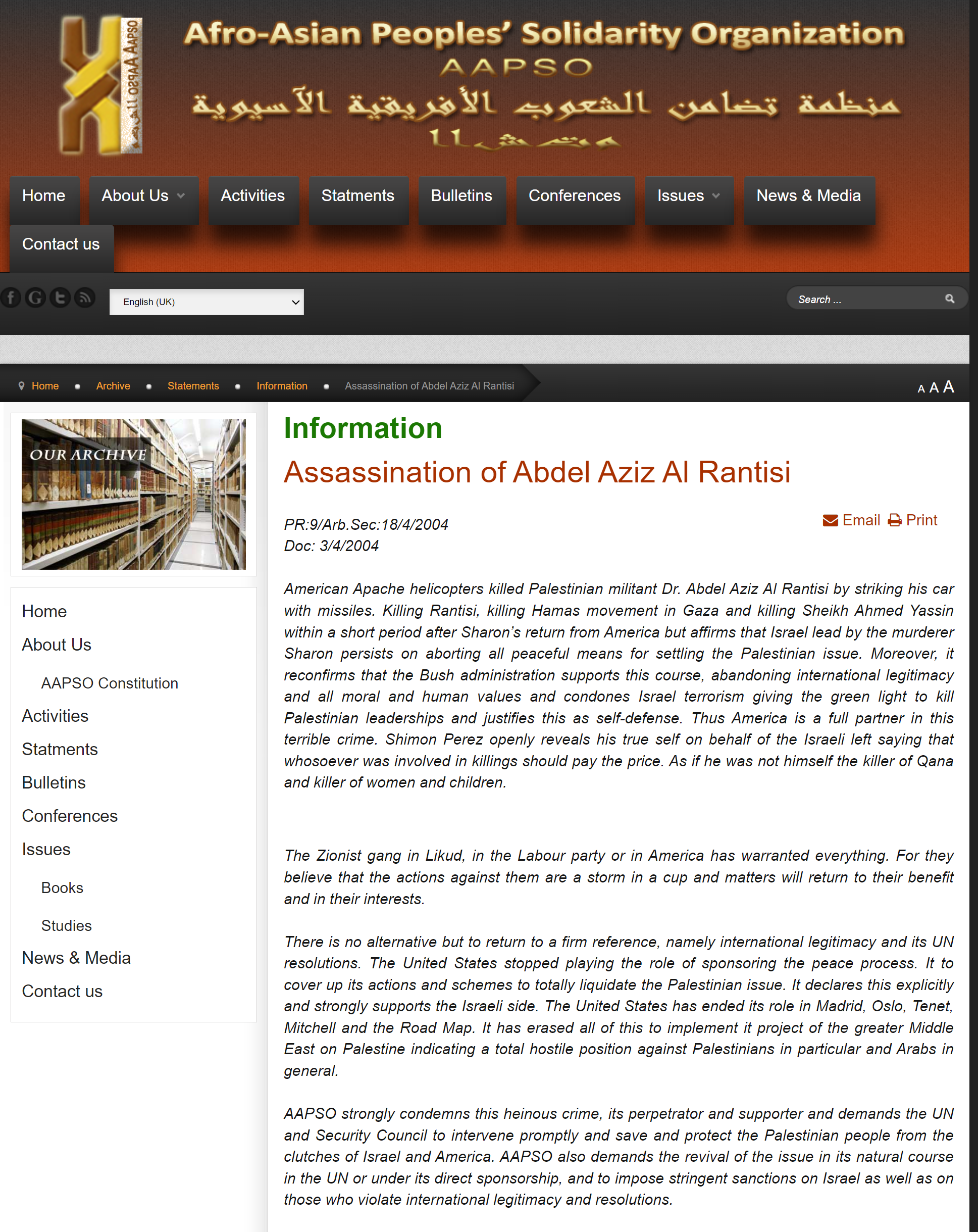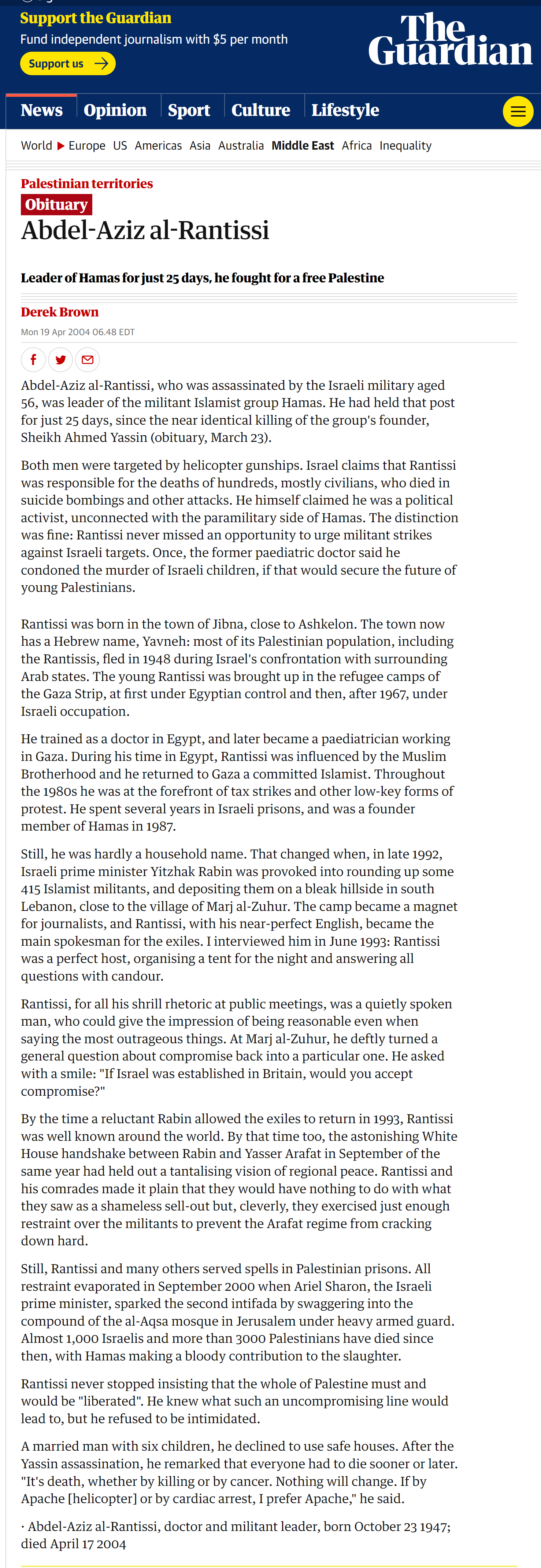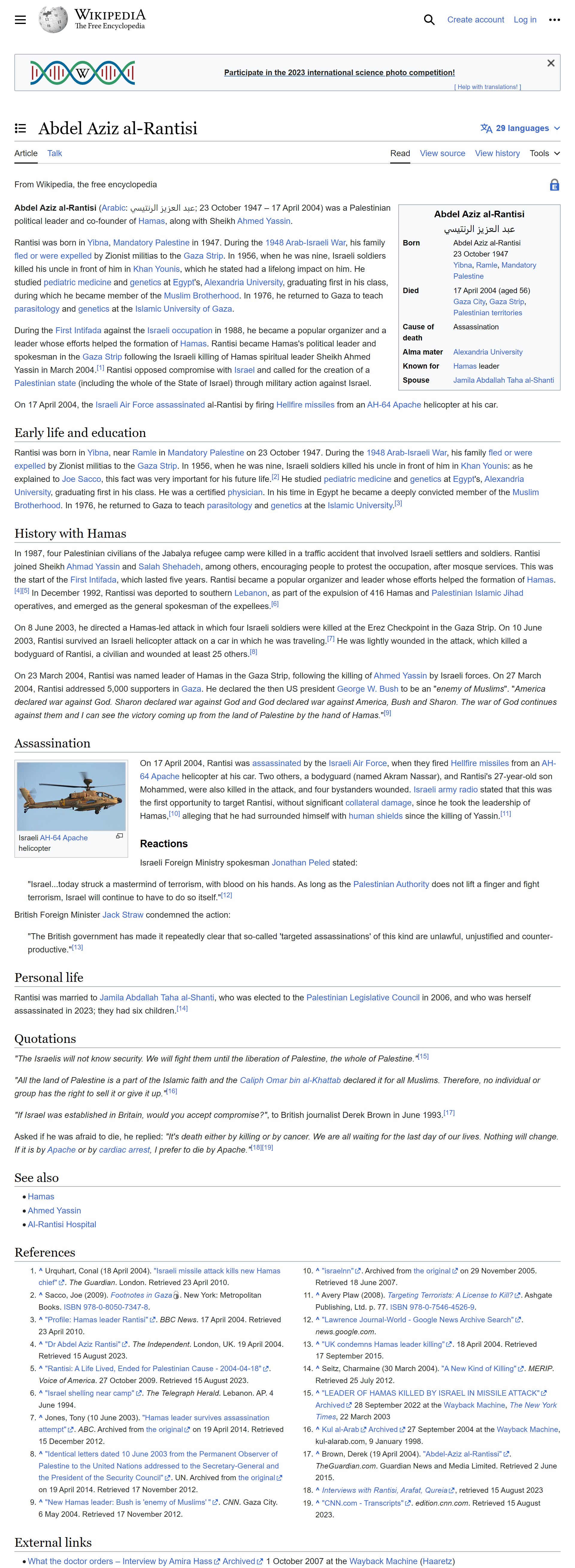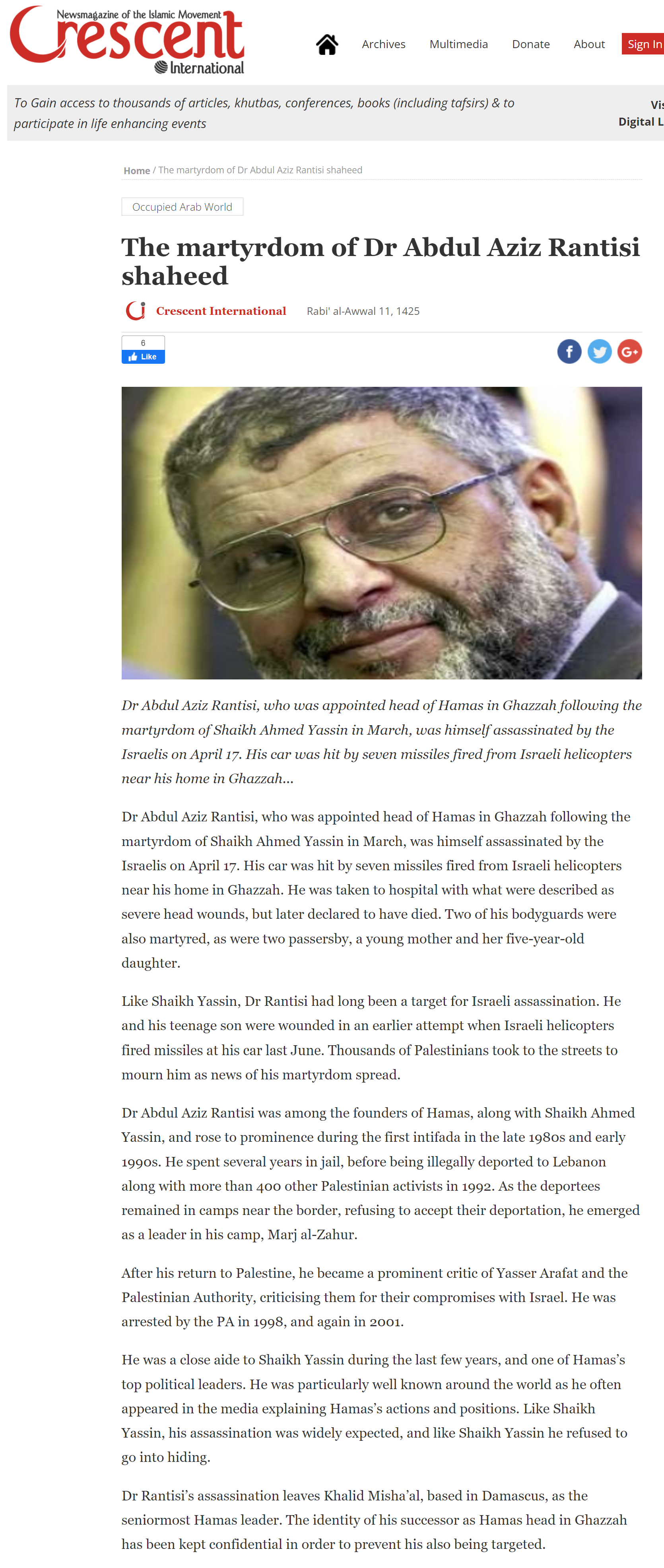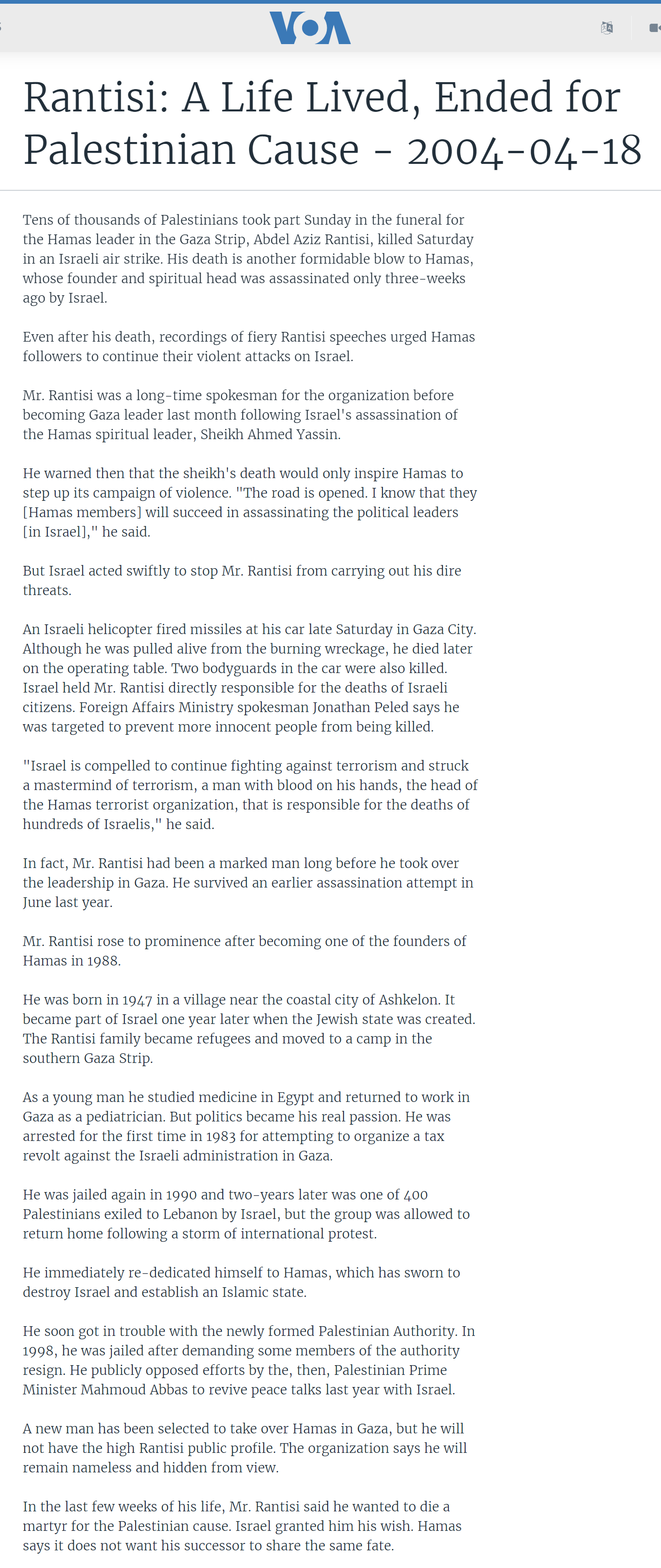 I had many telephone talks with Abdel Aziz al-Rantisi. I do not remember how many but it was quite a number. I think I recall doing some 3 interviews with him. Because of me doing these interviews the Israeli government assassinated al-Rantisi [sometimes spelled Rantissi]. In fact, just before we were talking this time the Israeli government attempted to kill al-Rantisi. He and I were doing an interview, with the recorder on, and the Israeli armed forces fired some rockets at him. They missed him but killed some Palestinians nearby. Rantisi said to me, “Thomas, we will have to reschedule this, I was just almost killed.” I heard an explosion.